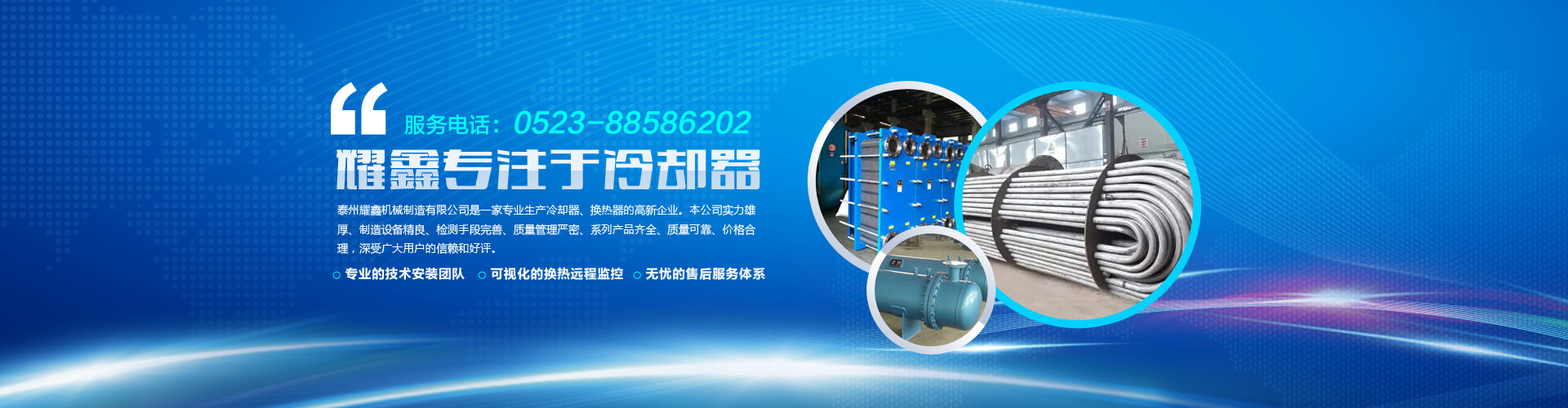 歡迎光臨泰州耀鑫機械制造有限公司官方網(wǎng)站,公司主營風冷卻器 油冷卻器 板式換熱器 列管式冷卻器 冷卻器